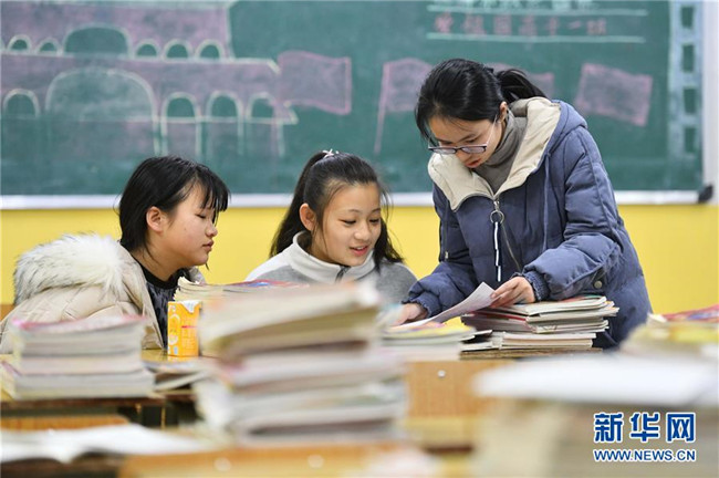 12月5日,在廣西融水苗族自治縣民族中學(xué),胡欣怡(右)在給學(xué)生輔導(dǎo)功課。胡欣怡是西北工業(yè)大學(xué)的在讀碩士研究生,今年9月來(lái)到融水苗族自治縣民族中學(xué),擔(dān)任語(yǔ)文老師。 新華社記者 黃孝邦 攝