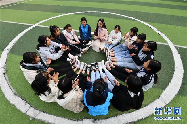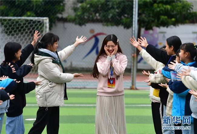 12月5日,在廣西融水苗族自治縣保桓中學(xué),林洋港(右三)和學(xué)生們?cè)谇驁?chǎng)上玩游戲。林洋港是西北工業(yè)大學(xué)的在讀碩士研究生,今年9月來(lái)到融水苗族自治縣?;钢袑W(xué)任物理老師。新華社記者 黃孝邦 攝