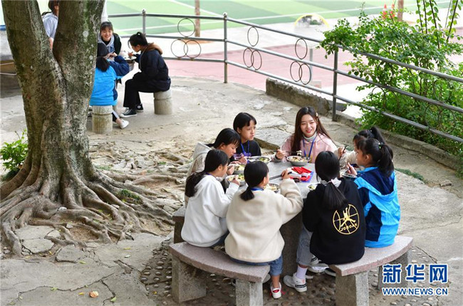 12月5日,在廣西融水苗族自治縣保桓中學(xué),林洋港(正面,右一)和學(xué)生們?cè)谛@里吃午飯。林洋港是西北工業(yè)大學(xué)的在讀碩士研究生,今年9月來(lái)到融水苗族自治縣?;钢袑W(xué)任物理老師。 新華社記者 黃孝邦 攝