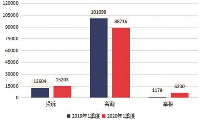 2020年一季度,12315投訴舉報(bào)指揮中心受理全省消費(fèi)者投訴15203件,業(yè)務(wù)咨詢88716件,違法舉報(bào)6230件,共計(jì)110149件(含省消協(xié)數(shù)據(jù)),與2019年同期相比下降了4.1%,其中舉報(bào)量受疫情的影響劇增。已辦復(fù)107026件,辦復(fù)率97.2%,為消費(fèi)者挽回經(jīng)濟(jì)損失637.84萬元。西安市、榆林市、咸陽市、寶雞市、渭南市的投訴舉報(bào)量位居全省前五位。