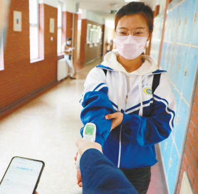 “先找到班級固定位置,根據(jù)地面標(biāo)記有間隔地排隊。”寧珂菡熟練地向記者介紹,“挨個進(jìn)入值班室后,面朝機(jī)器進(jìn)行人臉識別,然后登記信息、測量體溫,一切正常才能入校。”