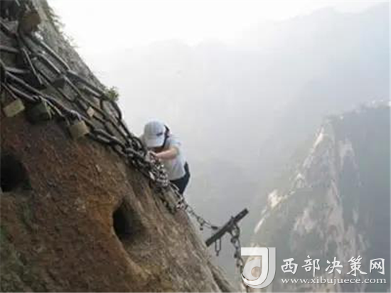 華山還有一處常人不敢涉足的險(xiǎn)境--- 鷂子翻身。鷂子翻身在華山東峰是通往下棋亭的必由之路。其路鑿于懸崖上,下視唯見(jiàn)寒索垂于凌空,不見(jiàn)路徑。游人至此,需面壁挽索,以腳尖探尋石窩,交替而下,其中幾步需如鷹鷂一般、左右翻轉(zhuǎn)身體才可通過(guò)。此景只留英雄客,婦孺難聞幾聲咳。這句話現(xiàn)在也未然,巾幗不讓須眉,以后應(yīng)是往來(lái)無(wú)懼者,皆是英雄客了。