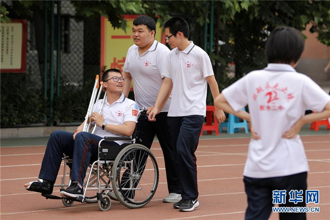 6月9日,河北省衡水市第二中學(xué)的高三學(xué)生推著一名腳部受傷的同學(xué)在操場上聊天散步。新華社記者 朱旭東 攝