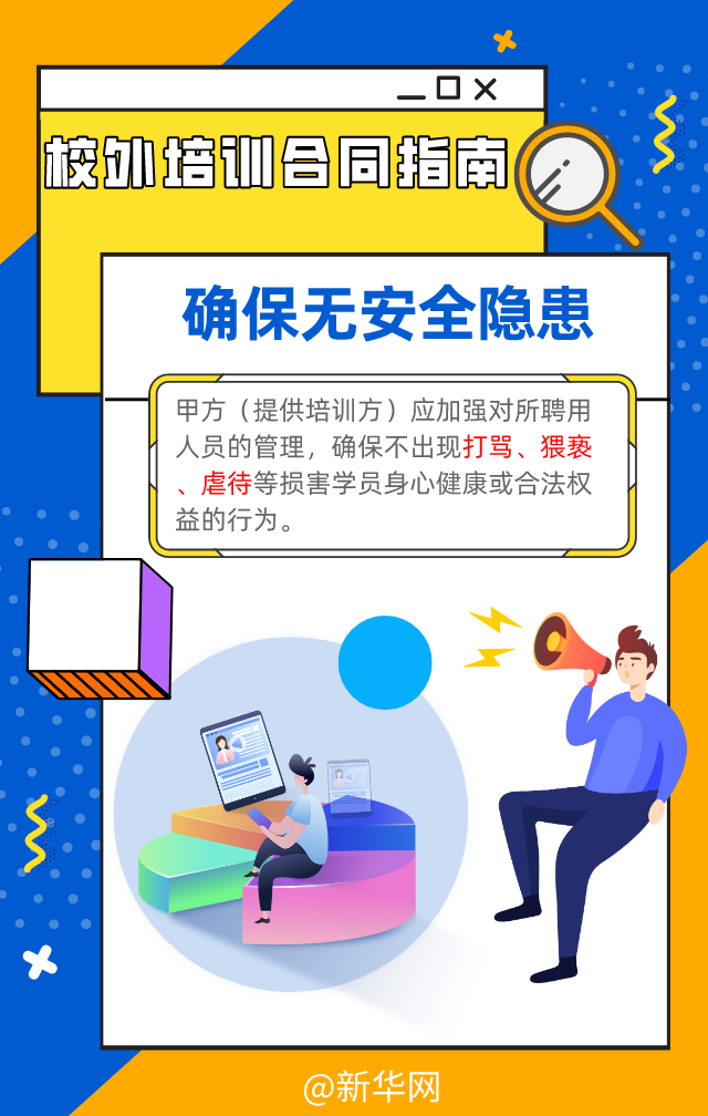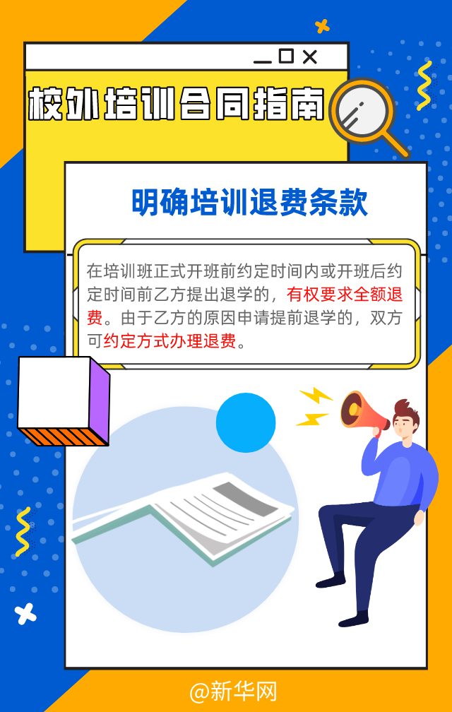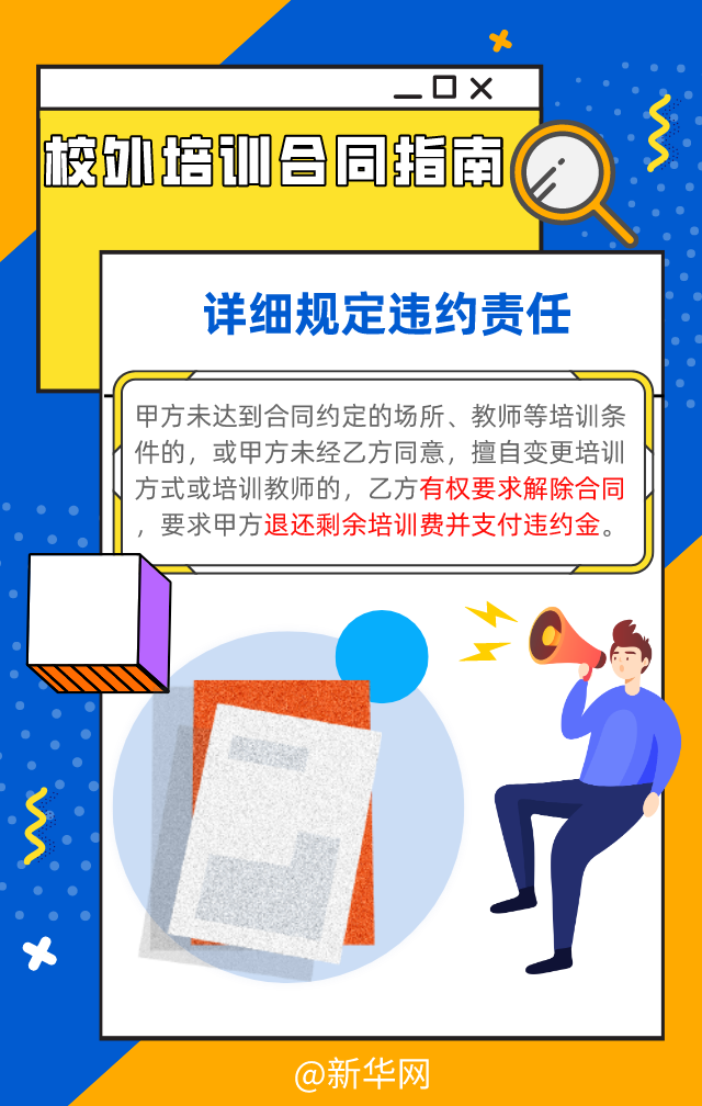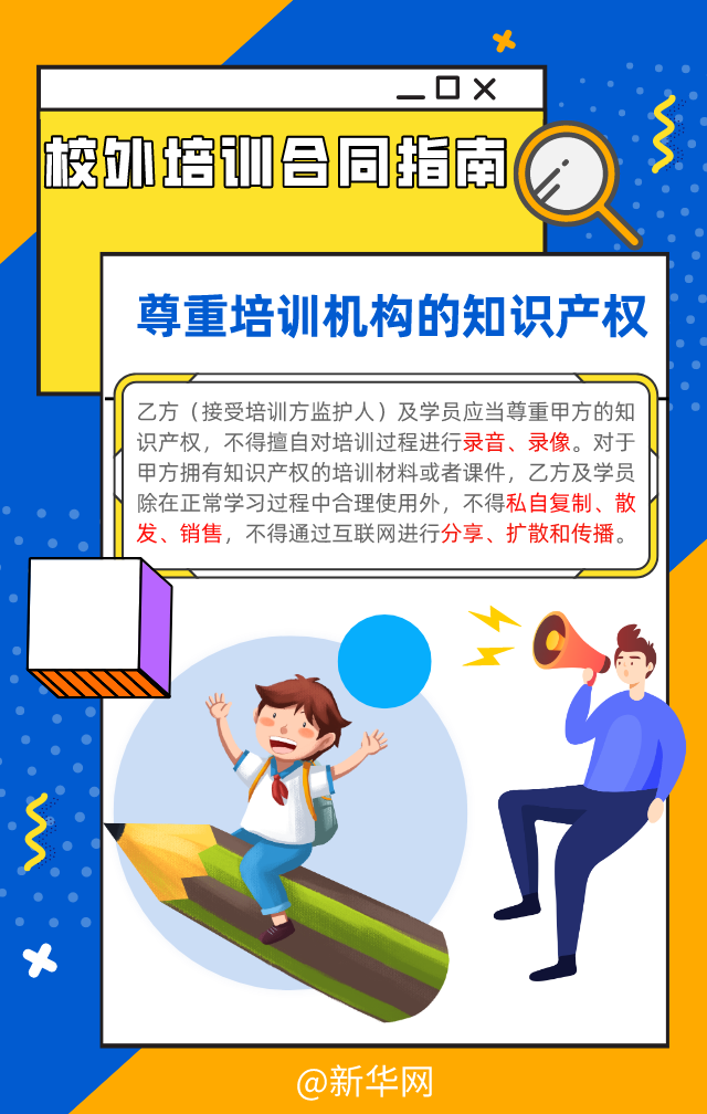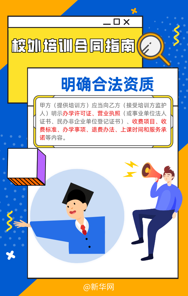 長期以來,校外培訓(xùn)機構(gòu)的資質(zhì)問題,以及部分培訓(xùn)機構(gòu)存在違規(guī)收費、退費難、卷款“跑路”現(xiàn)象,這些令學(xué)生和家長發(fā)愁。教育部、市場監(jiān)管總局近日發(fā)布《中小學(xué)生校外培訓(xùn)服務(wù)合同(示范文本)》,供培訓(xùn)者(學(xué)員)監(jiān)護人與開展中小學(xué)生校外培訓(xùn)的培訓(xùn)機構(gòu)簽訂培訓(xùn)合同時參照使用,為規(guī)范校外培訓(xùn)做出新的探索。一起來看看,這份“國家版”標(biāo)準(zhǔn)合同有哪些亮點?