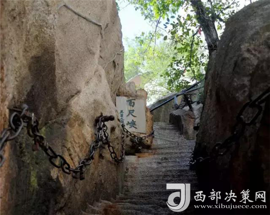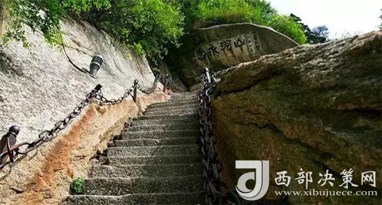 玉泉院出發(fā)直上到達華山門(步行登山路入口)。徒步經五里關、莎蘿萍、毛女洞、青柯萍、回心石、千尺幛、百尺峽、群仙觀、老君犁溝后,到達北峰。全長約6公里,耗時3小時左右。