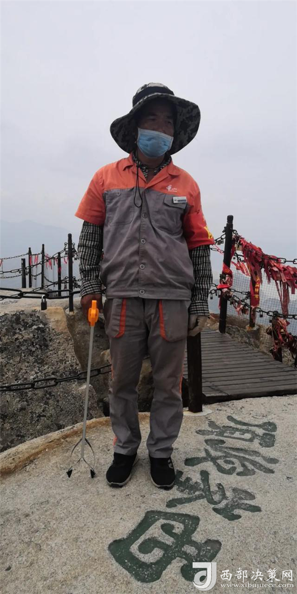 楊群社是景區(qū)一名環(huán)衛(wèi)工,負責華山西峰頂區(qū)域的衛(wèi)生保潔工作。為了給游客創(chuàng)造一個干凈整潔的游覽環(huán)境,熾熱的陽光下,楊群社在自己的區(qū)域內(nèi)不停地來回撿拾垃圾。