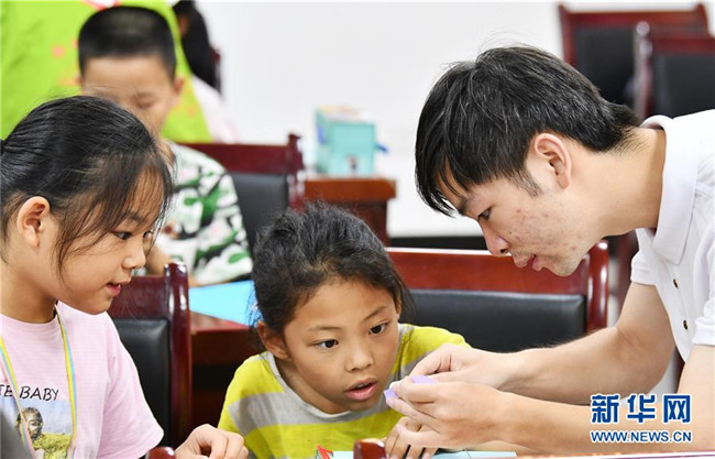8月13日,在貴州省思南縣雙塘街道麗景社區(qū)易地扶貧搬遷安置點,志愿者在指導(dǎo)孩子們學(xué)習(xí)剪紙。新華社記者 楊文斌 攝