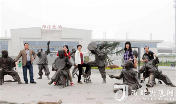 華山北站廣場上的老腔雕塑,老腔是陜西省非常古老的漢族戲曲表演形式,長期在華陰廣泛流傳,分老腔、時腔兩個劇種,表演方法和全國大致相同,先搭好臺子、撐好"亮子",然后借助燈火,以竹簽挑撥用皮革雕成的人物進行舞臺表演。流傳千年的老腔是中國首批國家級非物質(zhì)遺產(chǎn)保護項目。