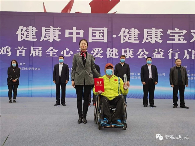 啟動儀式上,寶雞籍殘奧會鐵餅冠軍范良受聘擔任本次健康公益行形象大使,他曾代表中國出戰(zhàn)2004雅典殘奧會,2008北京殘奧會,2012年倫敦殘奧會,兩次以優(yōu)異的成績獲得金牌,并打破世界紀錄,為中國人民贏得了榮譽。其中,2004雅典殘疾人奧運會、2008北京殘奧會鐵餅金牌得主。退役后帶領寶雞地區(qū)殘疾人創(chuàng)業(yè),一直致力于公益事業(yè)發(fā)展。