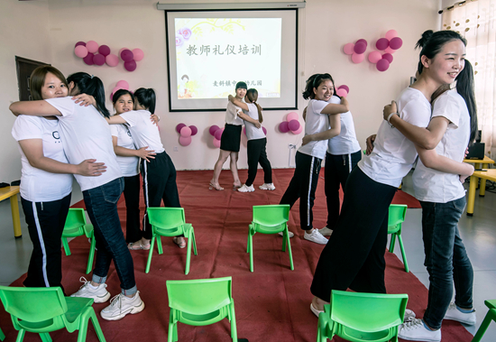 9月9日,江西省吉安市新干縣麥鎮(zhèn)中心幼兒園支教老師鄒小琳(左五)正在對(duì)該園幼教老師進(jìn)行禮儀培訓(xùn)。視覺中國(guó)供圖