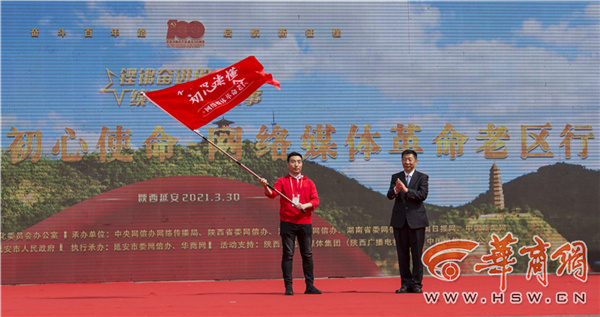 主會(huì)場活動(dòng)結(jié)束后,陜西分會(huì)場“在這里讀懂初心使命——網(wǎng)絡(luò)媒體革命老區(qū)行”網(wǎng)絡(luò)主題采訪活動(dòng)在延安寶塔山游客廣場正式啟動(dòng)。趙剛在分會(huì)場啟動(dòng)儀式上講話并向采訪團(tuán)授旗。陜西省委網(wǎng)信辦主任鮑永能主持啟動(dòng)儀式。中央網(wǎng)信辦網(wǎng)絡(luò)傳播局副局長邵波濤,陜西省委網(wǎng)信辦副主任王利參加啟動(dòng)儀式。延安市委副書記、政法委書記嚴(yán)漢平在啟動(dòng)儀式上致辭。媒體團(tuán)代表中國新聞網(wǎng)負(fù)責(zé)人吳慶才作表態(tài)發(fā)言。