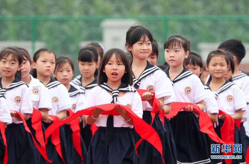 5月31日,少先隊(duì)員們?cè)谌腙?duì)儀式上宣誓。新華社記者 劉續(xù) 攝