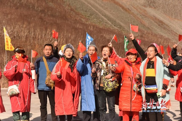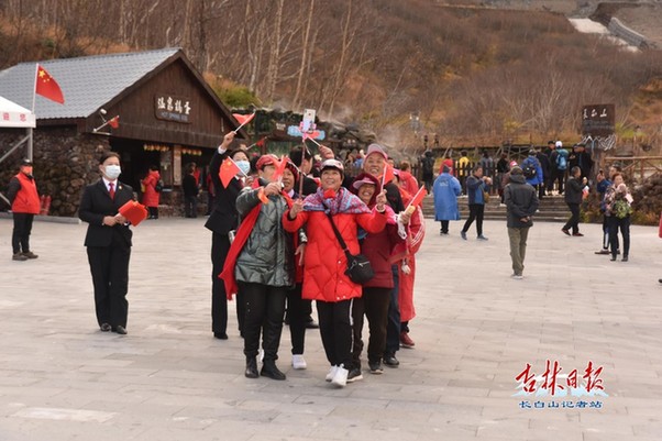 在溫泉廣場,幾位游客手持自拍桿,邊跳舞邊拍攝,展現(xiàn)著來長白山游玩的快樂心情。記者偶遇到精神飽滿的游客們手持國旗在廣場上唱響《歌唱祖國》,悠揚(yáng)的歌聲縈繞在長白山上空......