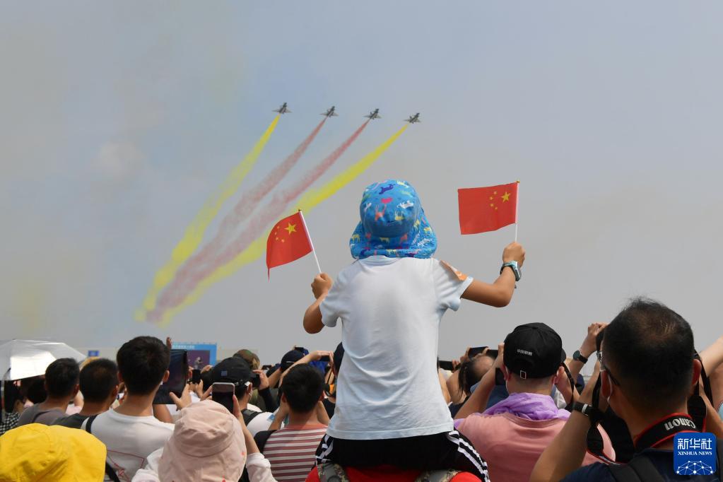 中國航展現(xiàn)場,五星紅旗隨處可見,成為全場最鮮艷的顏色。藍天之上,戰(zhàn)鷹向祖國報告:空軍官兵堅決捍衛(wèi)國家主權(quán),堅決捍衛(wèi)祖國統(tǒng)一,堅定維護世界和平?! ⌒氯A社記者劉濟美、高玉嬌、劉一諾