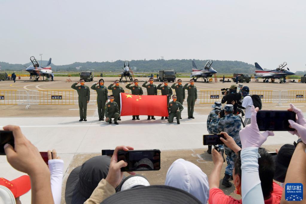 10月1日,在第十三屆中國國際航空航天博覽會上,中國空軍八一飛行表演隊飛行員舉國旗向觀眾致意。新華社記者 琚振華 攝