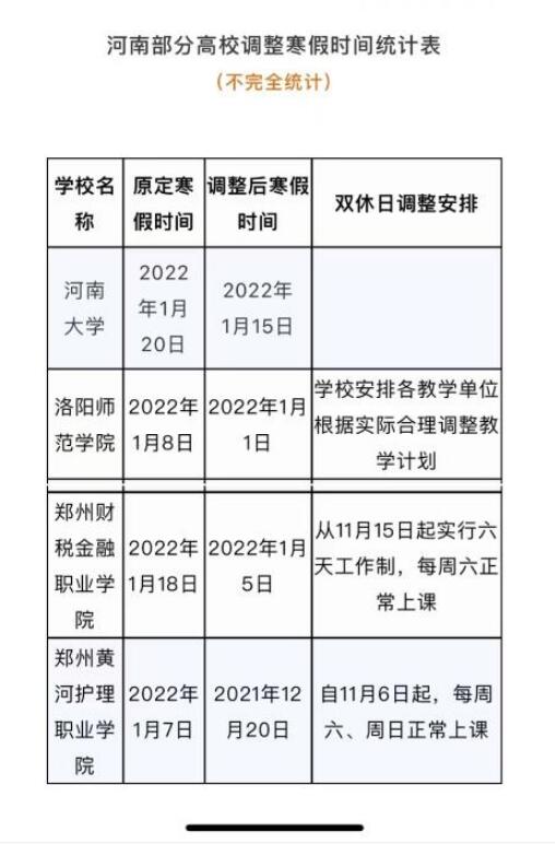 河南部分高校寒假時間調整。 截圖取自河南省教育廳微信公眾號