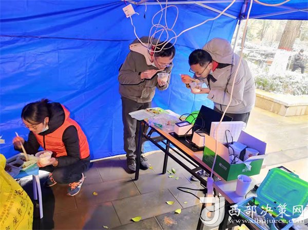 正當(dāng)隊(duì)員們準(zhǔn)備修整一天時,新的命令到了,要求醫(yī)療隊(duì)安排300名隊(duì)員支援雁塔區(qū)核酸采集工作,大家毫無怨言,坐上了趕赴雁塔區(qū)的大巴。這是最不尋常的一天,醫(yī)療隊(duì)承擔(dān)了雁塔區(qū)近10個居民區(qū)的核酸采樣任務(wù),且大部分都屬于封控區(qū)。核算采樣需上門采集,風(fēng)險大、難度高,因?yàn)樾畔⒉杉O(shè)備無法上樓,只能依靠人工信息錄入,隊(duì)員們身穿防護(hù)服,在操作極其困難的情況下做到了不漏一戶,不落一人。采集結(jié)束已是25日凌晨1點(diǎn),來自漢臺區(qū)的余晗和趙凌最后的采集任務(wù)已是凌晨2點(diǎn),此時的千年古都正飄落著冬日的雪花。這次入戶采集共完成49081人次。