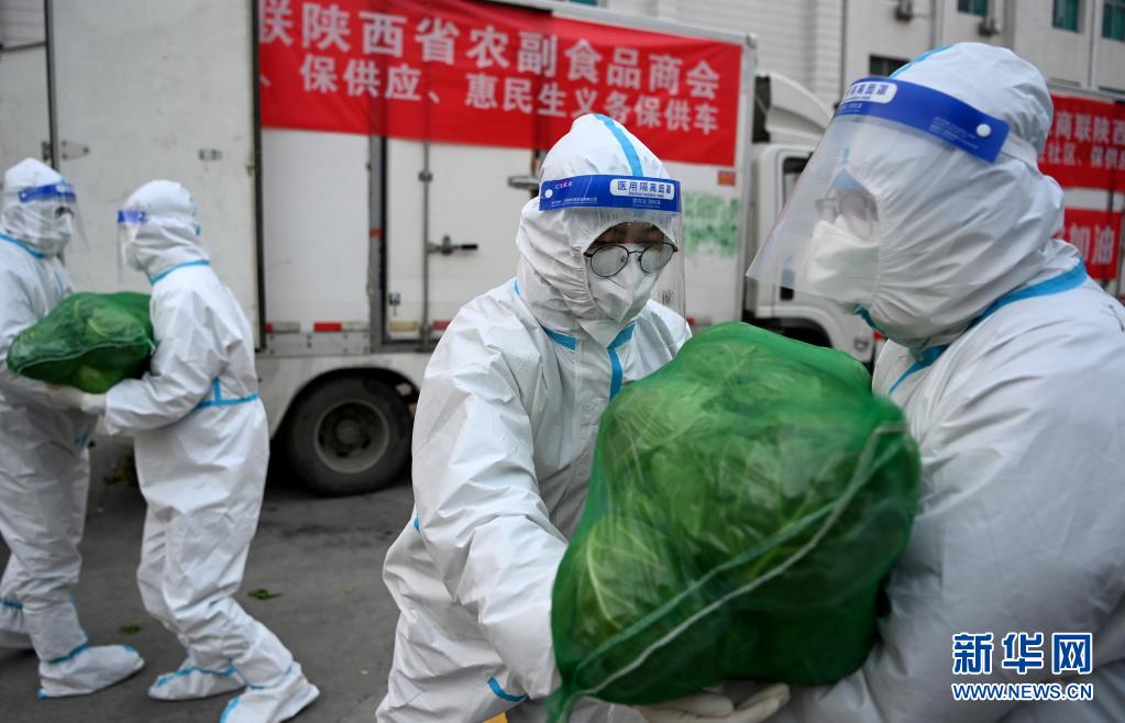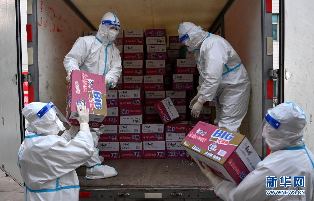 1月2日,西安醫(yī)學(xué)院的學(xué)生志愿者在搬運物資。當日,陜西省農(nóng)副食品商會向西安醫(yī)學(xué)院捐贈價值40余萬元的愛心蔬菜、食品物資、生活物資。