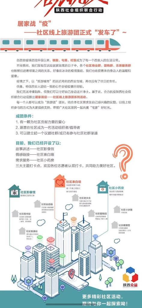 針對(duì)目前疫情防控形式,進(jìn)一步調(diào)動(dòng)激發(fā)社區(qū)內(nèi)生力量動(dòng)員社區(qū)自組織、志愿服務(wù)隊(duì)等團(tuán)體力量,合力抗疫陜西社會(huì)組織聯(lián)合行動(dòng)倡議志愿者在社區(qū)開展“家門口的志愿服務(wù)”社區(qū)實(shí)踐,引導(dǎo)有條件的居民自助互助。