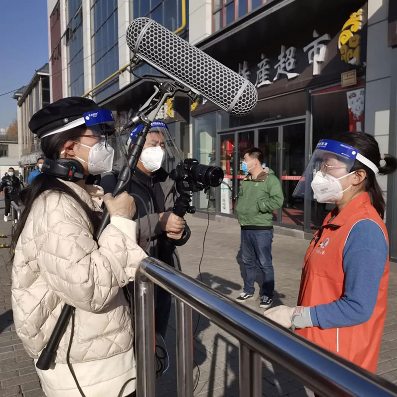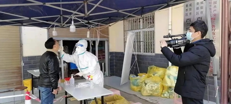 2021年12月21日,咸陽(yáng)廣播電視臺(tái)記者李寒廣(右)、張潔在核酸檢測(cè)現(xiàn)場(chǎng)采訪。