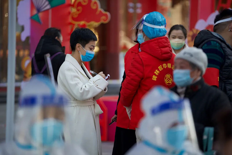 2021年12月21日,陜西日?qǐng)?bào)社記者齊卉(左)在采訪參與一線防疫的志愿者。