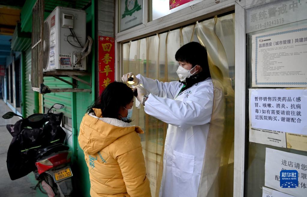 1月7日,西安市未央?yún)^(qū)西唐寨村一家藥店的負(fù)責(zé)人韓春陽(yáng)在為村民看診。疫情發(fā)生后,藥店一直沒(méi)有關(guān)門(mén),韓春陽(yáng)每天會(huì)接到六七個(gè)線(xiàn)上線(xiàn)下的咨詢(xún),下班后還會(huì)給鄰近村子的村民送藥。