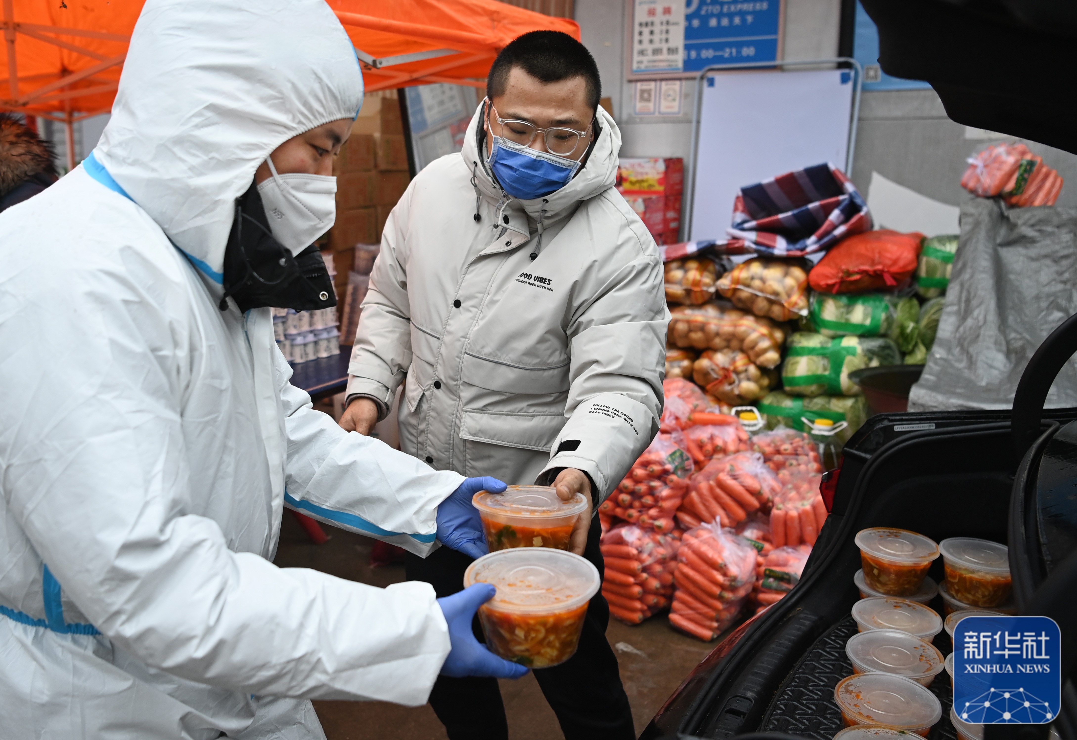 1月8日,許凱(右) 與志愿者一起出門運(yùn)送“愛(ài)心餐”。