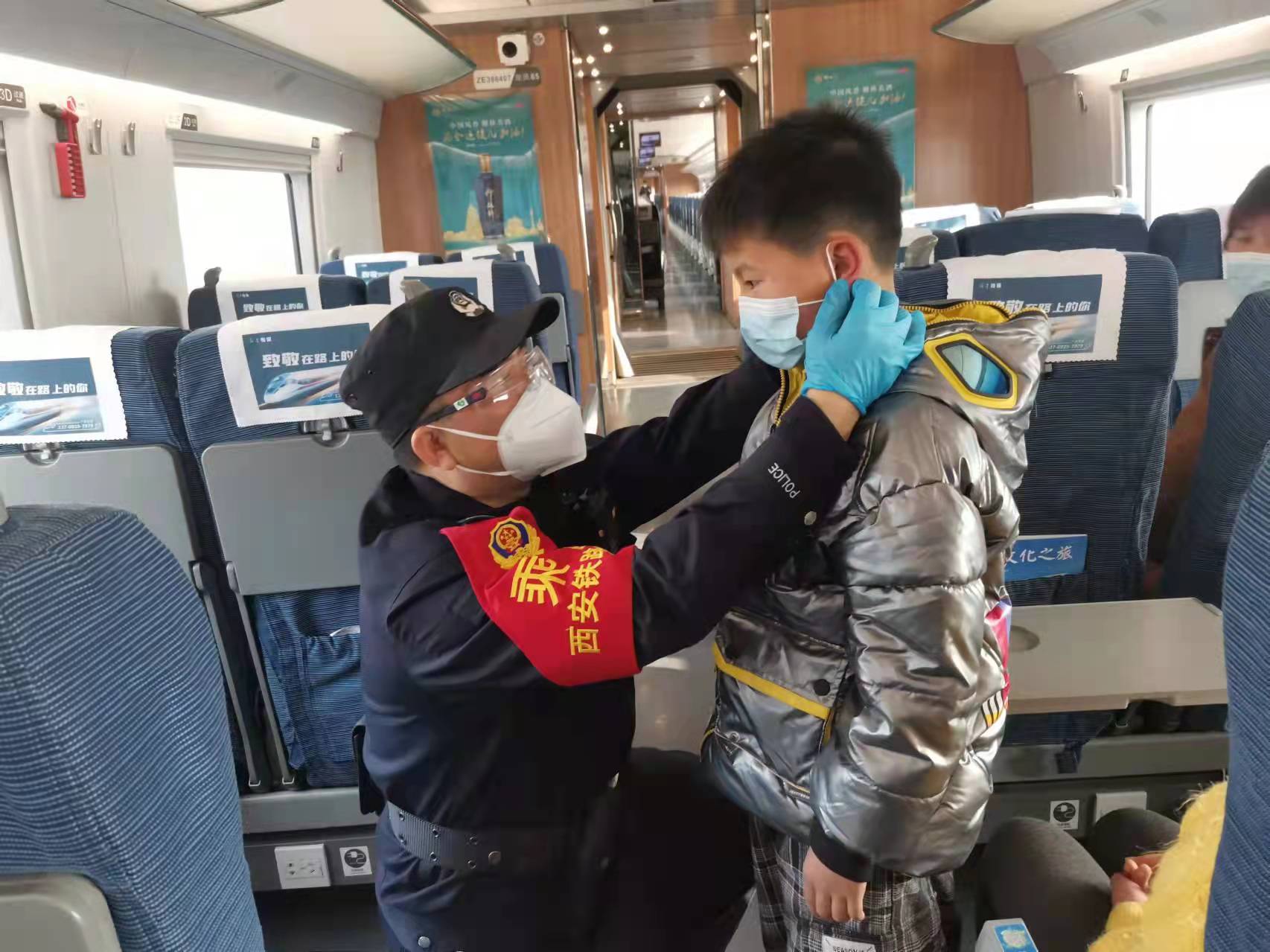 圖為乘警趙英斌在高鐵上教小朋友正確佩戴口罩(受訪(fǎng)者供圖)