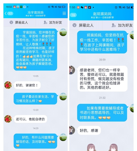 面對家長在抗“疫”一線經(jīng)受的各種考驗,孩子們時刻惦記,情緒起伏較大。班主任和任課老師密切溝通,溫暖陪伴,守護(hù)抗“疫”一線工作人員子女的心理健康。通過微信視頻連線、電話等方式與孩子們密切溝通,用質(zhì)樸的話語與孩子們談心,帶去學(xué)校的關(guān)心和溫暖,緩解他們不安的情緒。