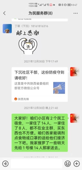 看著手里拎的幾顆白菜、蘿卜、西紅柿,我感到慚愧難當(dāng),作為一名黨員、一名下沉干部,實(shí)在是失職,沒有履行好“民之所憂,我必念之;民之所盼,我必行之”的使命擔(dān)當(dāng)。投送完愛心菜到家后,我立即在群里倡議小區(qū)下沉干部對(duì)1-3-2302的務(wù)工人員開展愛心救助活動(dòng),并從自家的抗疫儲(chǔ)備物資里勻出了2袋子蔬菜、豆腐乳、魚醬罐頭、口罩、水果等物資,并附上了溫馨小紙條,寫上我的聯(lián)系電話,鼓勵(lì)他們堅(jiān)定克服困難的信心和決心。第二天,社區(qū)領(lǐng)導(dǎo)、小區(qū)鄰居們得知情況后,紛紛伸出援助之手,不到半小時(shí),鍋灶有了、菜刀案板有了、糧食蔬菜也都有了…,社區(qū)的慰問品也送來(lái)了。大伙不僅給他們送去了物資,更送去了關(guān)心和安慰,他們的生活起居也迅速融入了小區(qū)大家庭,業(yè)主群里每天都有人對(duì)他們噓寒問暖,他們也經(jīng)常在業(yè)主群曬他們做的川味美食。他們私下跟我說(shuō),這幾年,他們?cè)诤?、新疆等地都遇到過(guò)疫情,但最讓他們感動(dòng)的還是西安,黨和政府的細(xì)致安排、西安人民的熱情相助,讓他們?cè)谒l(xiāng)異地孤立無(wú)援時(shí),第一次感到不慌了。