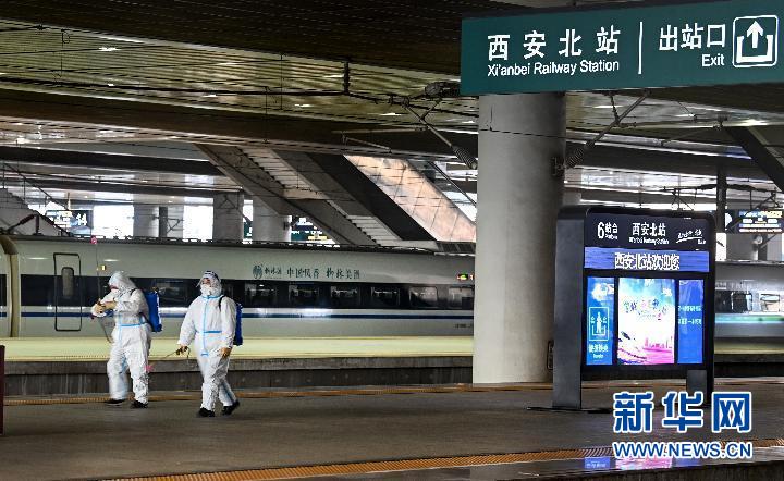 1月16日,工作人員對西安北站站臺進行消殺。新華社記者 陶明 攝