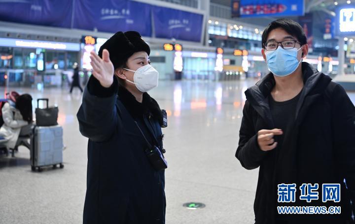 1月16日,西安北站客運員(左)在候車大廳引導旅客乘車。新華社記者 陶明 攝