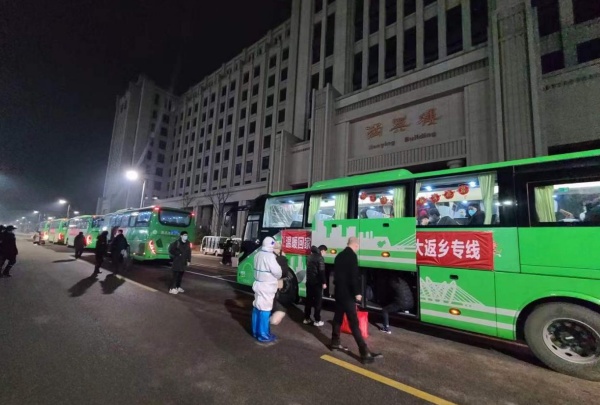 為了保障將創(chuàng)新港學(xué)生閉環(huán)轉(zhuǎn)運(yùn)至西安“兩站一場”,灃西新城對接西咸公交集團(tuán),協(xié)調(diào)了50輛公交車、大巴車,根據(jù)學(xué)生訂票時(shí)間制定班次,全程參與暖心返鄉(xiāng)行動,24小時(shí)不停歇,點(diǎn)對點(diǎn)將學(xué)生運(yùn)送至“兩站一場”。