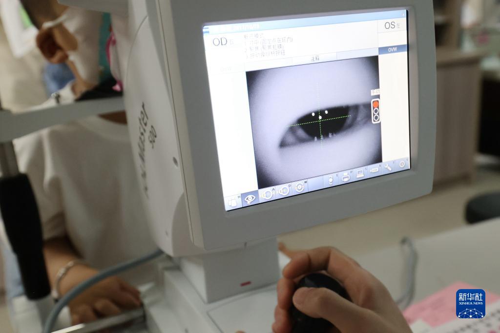 6月5日,湖南省常寧市第三人民醫(yī)院的醫(yī)護(hù)人員在為小朋友驗光。新華社發(fā)(周秀魚春 攝)