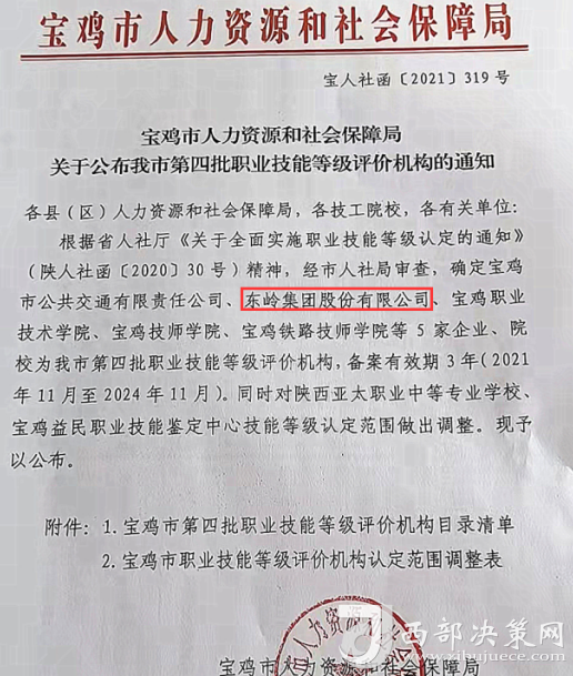 為了建立技能人才培養(yǎng)管理的長效機制,東嶺集團積極與省市人社等相關部門對接,積極創(chuàng)造內(nèi)部條件,于2021年取得了“寶雞市第四批職業(yè)技能等級評價機構”認證資質,公司可以自主開展技能人才評價工作,頒發(fā)與國家職業(yè)資格證書同等效用的職業(yè)技能等級證書。取得證書后的學員,除了政府有1500元(中級)、2000元(高級)的現(xiàn)金補貼,公司也會根據(jù)實際情況提薪升職。