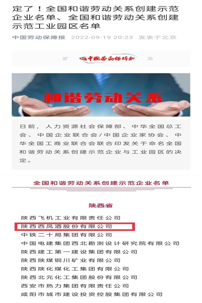 西部決策網(wǎng)訊(記者艾米杰 韓宗憲 通訊員 許凡 張?zhí)炝ⅲ闃淞⑹痉兜湫汀⒑霌P人文關(guān)懷、傳遞和諧溫暖,進一步推動廣大企業(yè)深入開展和諧勞動關(guān)系創(chuàng)建活動,促進構(gòu)建中國特色和諧勞動關(guān)系。近日,人力資源和社會保障部、中華全國總工會、中國企業(yè)聯(lián)合會/中國企業(yè)家協(xié)會、中華全國工商業(yè)聯(lián)合會聯(lián)合印發(fā)《關(guān)于命名全國和諧勞動關(guān)系創(chuàng)建示范企業(yè)與工業(yè)園區(qū)的決定》,陜西西鳳酒股份有限公司榜上有名,榮獲“全國和諧勞動關(guān)系創(chuàng)建示范企業(yè)”稱號。