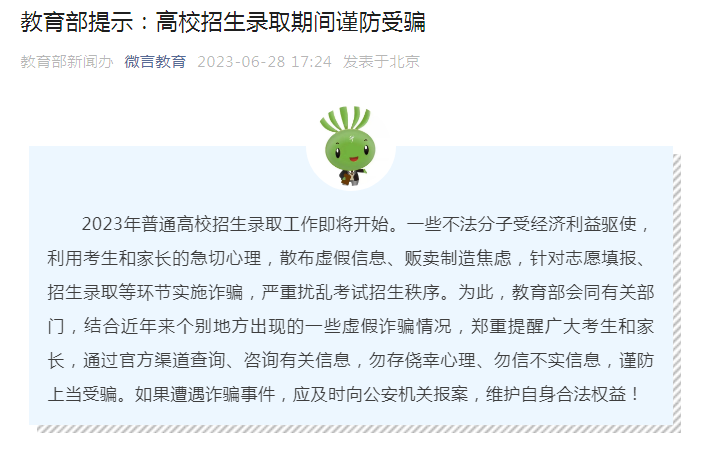 據(jù)悉,近年來,一些社會機構(gòu)和個人通過網(wǎng)絡(luò)平臺發(fā)布有關(guān)涉考涉招信息,存在政策解讀不準(zhǔn)確、信息提供不真實等問題,有的甚至通過假冒、仿冒高校和招生考試機構(gòu)的官方網(wǎng)站、公眾賬號編造散布虛假信息,迷惑考生和家長,實施詐騙,嚴(yán)重擾亂考試招生秩序。