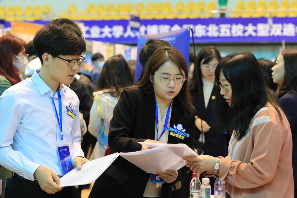 哈工大“就業(yè)推薦官”(中)向企業(yè)招聘負(fù)責(zé)人現(xiàn)場推薦畢業(yè)生。