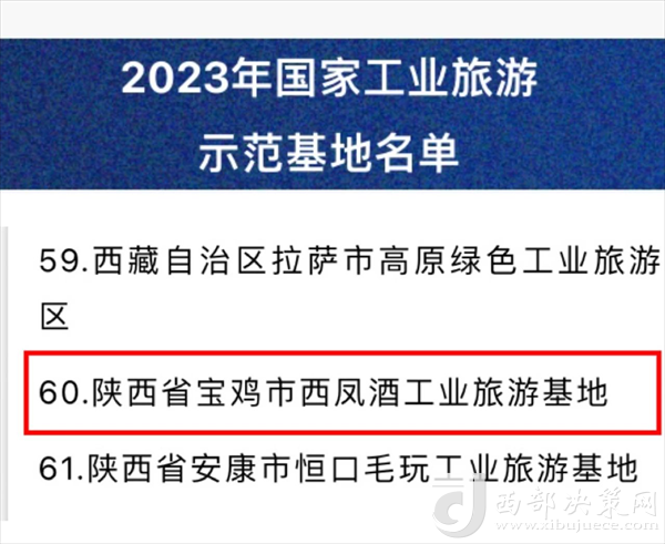 西部決策網(wǎng)訊(記者劉玉 韓宗憲 通訊員李秀麗 張雨萌)10月12日,從文化和旅游部傳來喜訊,西鳳股份公司榮獲“國家工業(yè)旅游示范基地”。