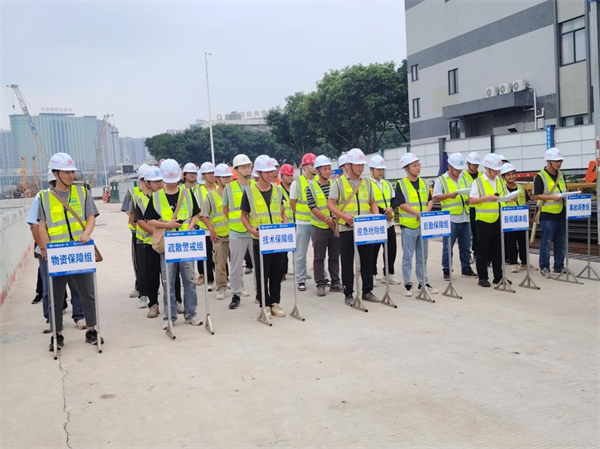 演練模擬項(xiàng)目車站在深基坑土方開挖過程中出現(xiàn)涌水涌泥緊急情況,接到“險(xiǎn)情”匯報(bào)后,項(xiàng)目負(fù)責(zé)人歐瓊第一時(shí)間迅速啟動應(yīng)急預(yù)案,立即組織疏散警戒組人員到達(dá)現(xiàn)場緊急疏散人群,做好警戒,確保搶險(xiǎn)道路暢通。應(yīng)急演練從發(fā)現(xiàn)險(xiǎn)情、啟動應(yīng)急預(yù)案、應(yīng)急搶險(xiǎn)到恢復(fù)正常生產(chǎn)秩序,時(shí)長近60分鐘,啟用各類車輛、機(jī)械10多輛(臺)。演練人員聞警而動,各個環(huán)節(jié)緊密銜接,各職能部門密切配合,處置得當(dāng),搶險(xiǎn)反應(yīng)迅速,在短時(shí)間內(nèi)完成了搶險(xiǎn)救援工作,整個演練過程緊張有序,取得了良好的效果。