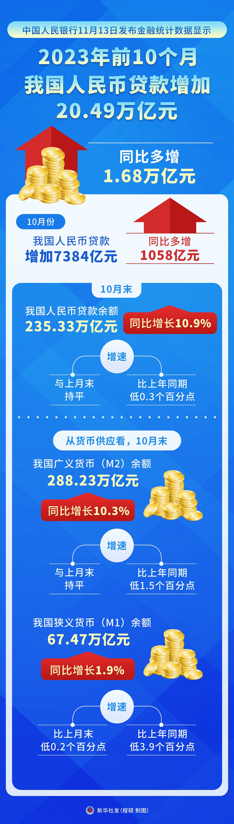 中國人民銀行13日發(fā)布金融統(tǒng)計數(shù)據(jù)顯示,前10個月我國人民幣貸款增加20.49萬億元,同比多增1.68萬億元。10月份,我國人民幣貸款增加7384億元,同比多增1058億元。