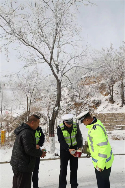 在巡邏途中,民輔警發(fā)現(xiàn)部分車輛滯留在路上。他們?yōu)闇赳{乘人員送上泡面等物資,讓各位駕乘人員感受到了延長公安交警的濃濃暖意,舒緩駕乘人員旅途滯留的焦慮情緒。同時(shí),民警提醒駕駛?cè)思皶r(shí)關(guān)注天氣情況和路況信息,確保行車安全。