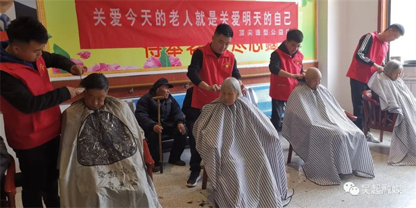12月18日上午9點(diǎn),吳起縣迎賓街的頂尖造型理發(fā)店擠滿(mǎn)了人,店內(nèi)愛(ài)心義剪志愿者不停揮舞著手上的剪刀為老人們理發(fā)。