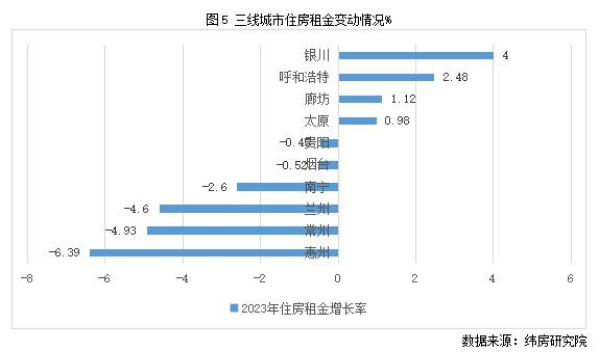 三線城市住房租金漲跌接近參半。住房大數(shù)據(jù)監(jiān)測的重點(diǎn)40城中包括10個三線城市,其中4個城市2023年住房租金小幅上漲,6個城市下降。其中,銀川和呼和浩特漲幅最高,分別為4%和2.48%;惠州、常州和蘭州住房租金跌幅較高,分別為6.39%、4.93%和4.6%。