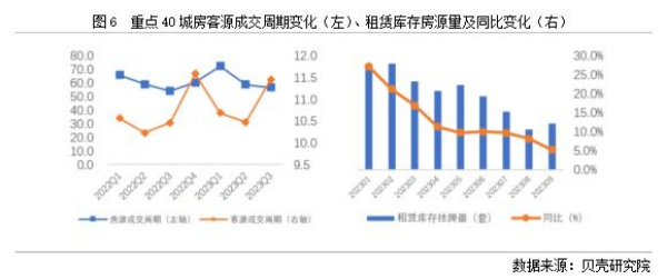 依據(jù)貝殼研究院數(shù)據(jù)監(jiān)測,全國重點(diǎn)40城2023年三季度房客源成交周期分別為56.7、11.5天,房源成交周期環(huán)比減少2.1天,同比增加2.7天;客源成交周期環(huán)比延長1天,同比延長1天。隨著個人租賃房源供應(yīng)的增加,疊加保障性租賃住房、市場化集中式租賃房源的增加,個人業(yè)主出租房源出租速度減緩。從庫存房源來看,2023年1-9月租賃庫存房源量均呈現(xiàn)同比增加的趨勢,與此同時,租客租房面臨的選擇項(xiàng)增多,租客對于租賃房源可選類型和房源量均有增加。