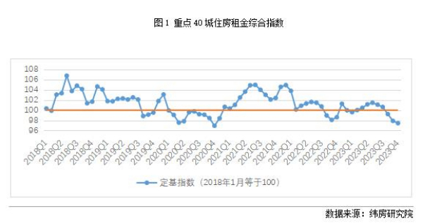 分時間段來看,住房租金總體呈現(xiàn)先升后降的趨勢。受到校畢業(yè)生租房需求增加的影響,住房租金水平波動上漲,從2022年末的98.61漲至2023年7月的101.45。隨著需求的釋放,住房租金隨后進(jìn)入下降趨勢,核心40城租金指數(shù)降至2023年末的97.44。2023年末的租金水平與2022年末相比,下降了1.19%。租金水平雖有所下降,但總體穩(wěn)定,未出現(xiàn)大起大落。