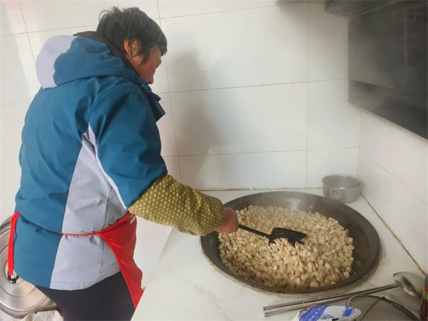 話語間,油鍋里的肉臊子“滋啦啦”地在鍋內(nèi)翻滾,白凈的肉丁逐漸變的金黃。