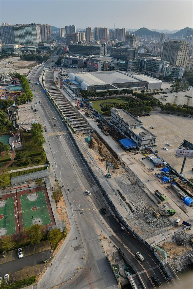 虎門(mén)大道站是東莞市地鐵2號(hào)線(xiàn)三期工程的第2個(gè)車(chē)站,為地下二層單柱雙跨箱型結(jié)構(gòu)島式車(chē)站。車(chē)站主體結(jié)構(gòu)長(zhǎng)496米,標(biāo)準(zhǔn)段寬20.9米,端頭段寬約28米,基坑深約19米,面積約21408平方米;附屬設(shè)7個(gè)出入口、4組風(fēng)亭,均為單層結(jié)構(gòu),基坑深約10至12米,面積約6490平方米。全站采用明挖法施工。