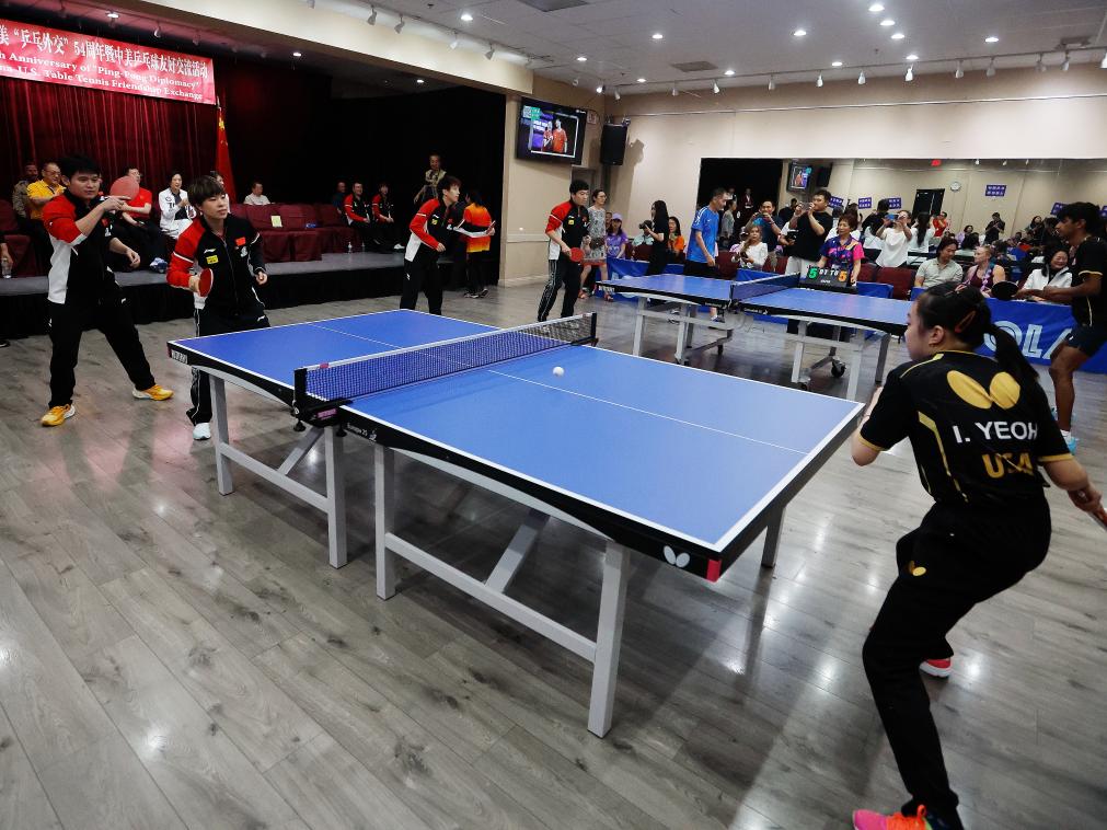 這是7月13日在美國(guó)內(nèi)華達(dá)州拉斯維加斯拍攝的紀(jì)念中美“乒乓外交”54周年暨中美乒乓球友好交流活動(dòng)現(xiàn)場(chǎng)。新華社發(fā)(邱晨攝)
