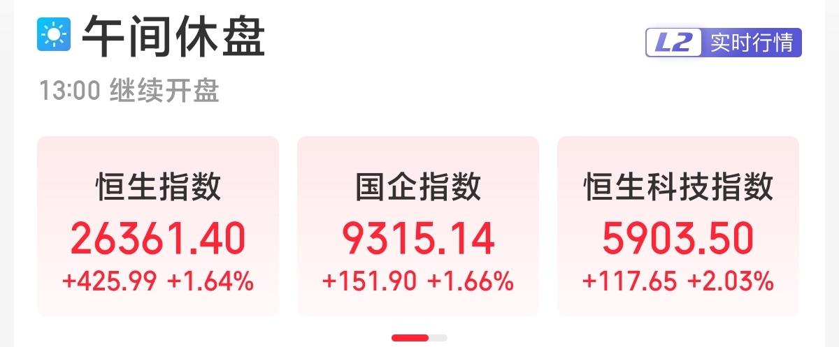 周四早盤,港股三大指數(shù)高開高走。截至午間收盤,恒生指數(shù)漲1.64%,恒生科技指數(shù)漲2.03%,恒生國(guó)企指數(shù)漲1.66%。大市半日成交額1271億港元。